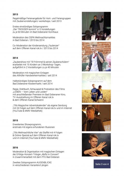 Als Zauberkünstler möchte ich mich weiterentwickeln, um die neue Show zu perfektionieren und weitere TV-Projekte zu konzeptionieren und umzusetzen, denn: Till Frömmel live bedeutet immer Spaß auf beiden Seiten – Humor, Fantasie & Magie erlebt ihr in verschiedensten Facetten!